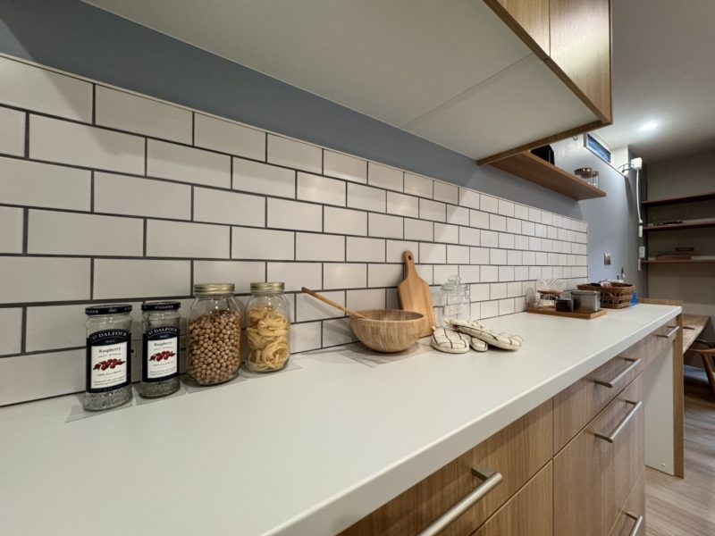 カップボード上の白タイルも目地は