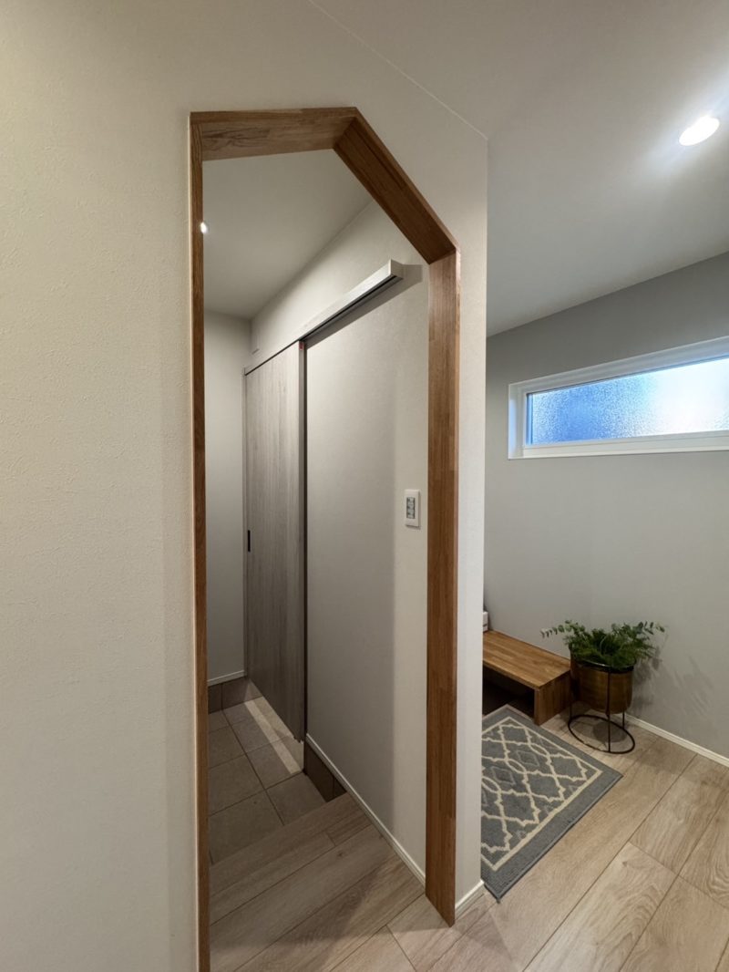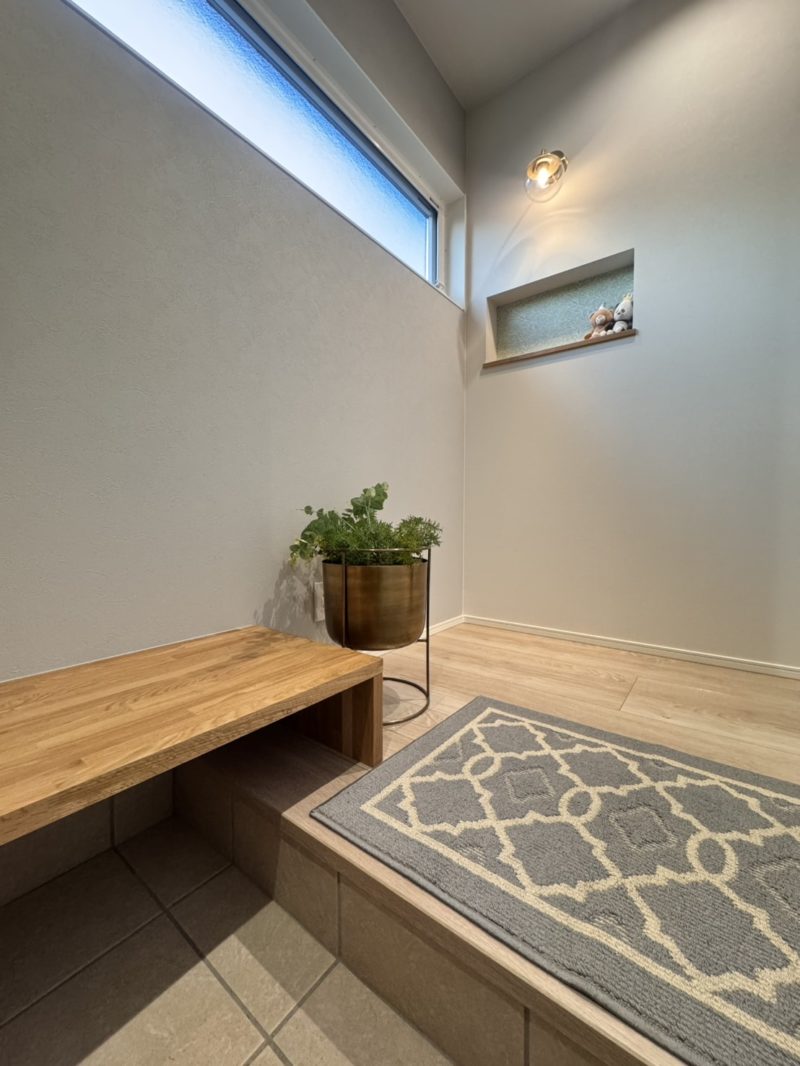 くつを脱ぎ履きできるベンチや玄関正面にはデザイン性のある