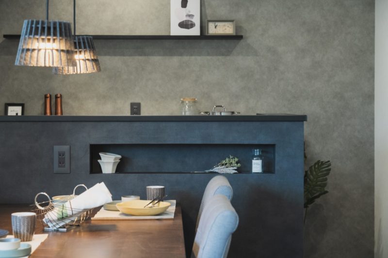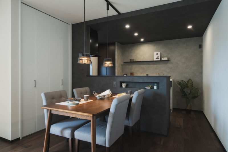 キッチンを下がり天井にすることで空間の区切りを演出できます。