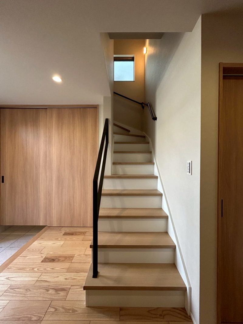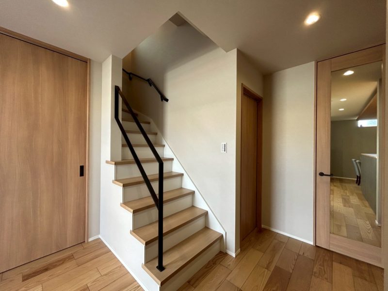 〇木目調に映えるブラックアイアン階段手摺が格好いい