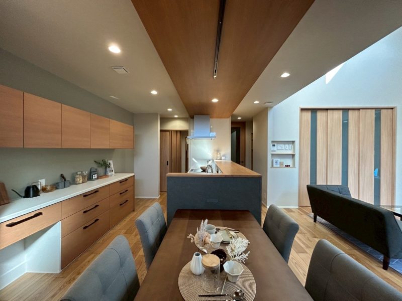 〇カップボードに並列したスタディカウンターは色柄を合わせで一体型家具調に