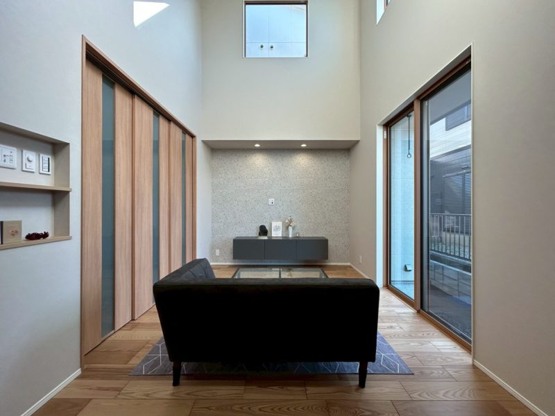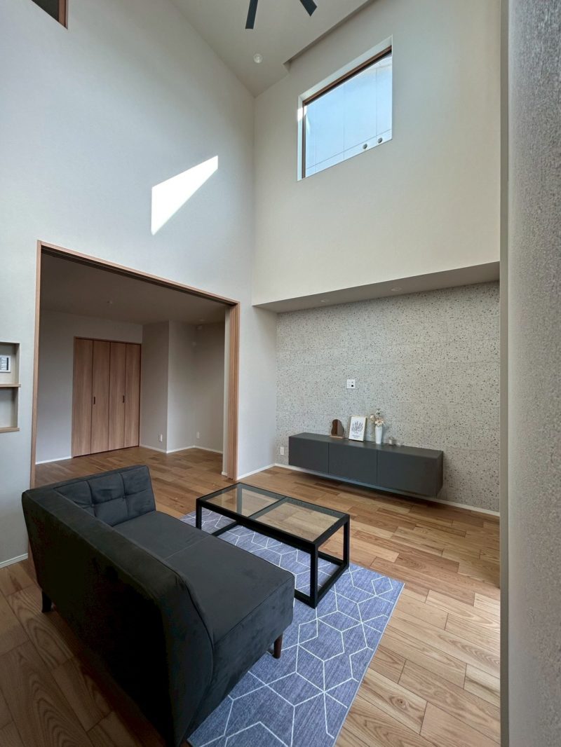 〇吹抜けハイサイドライトから柔らかな光が降り注ぐLDK