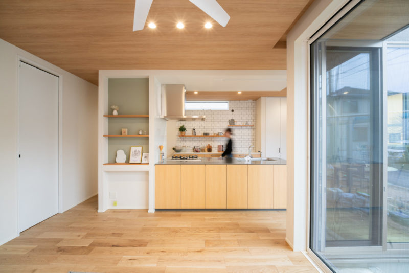 軒天とつながる木目の天井クロスが、外と内をやさしくつなぐ空間。