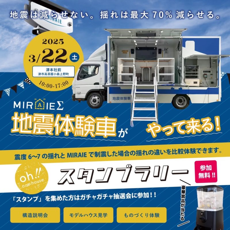 【津市高茶屋小森上野町】2025月3月22日(土)地震体験車がやって来る!構造説明会&モデルハウス見学会も同時開催☆