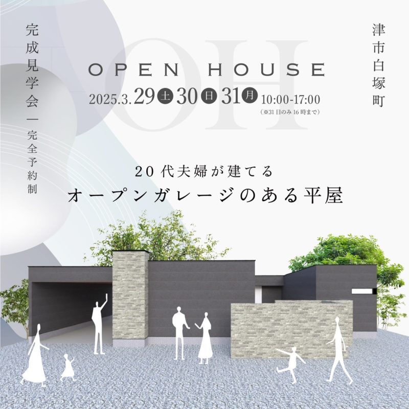 【津市白塚町】3月29日(土)▶︎31日(月)20代夫婦が建てる『オープンガレージのある平屋』