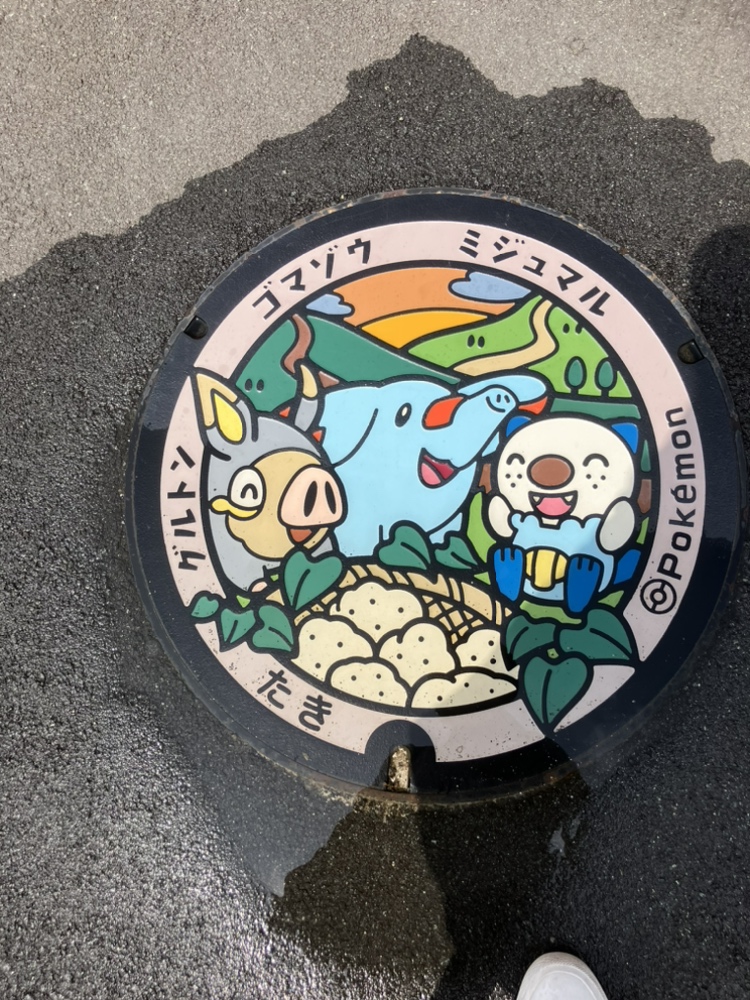 先日、五桂池の動物園に行ったときに子どもがポケモンのマンホールを見つけました。
