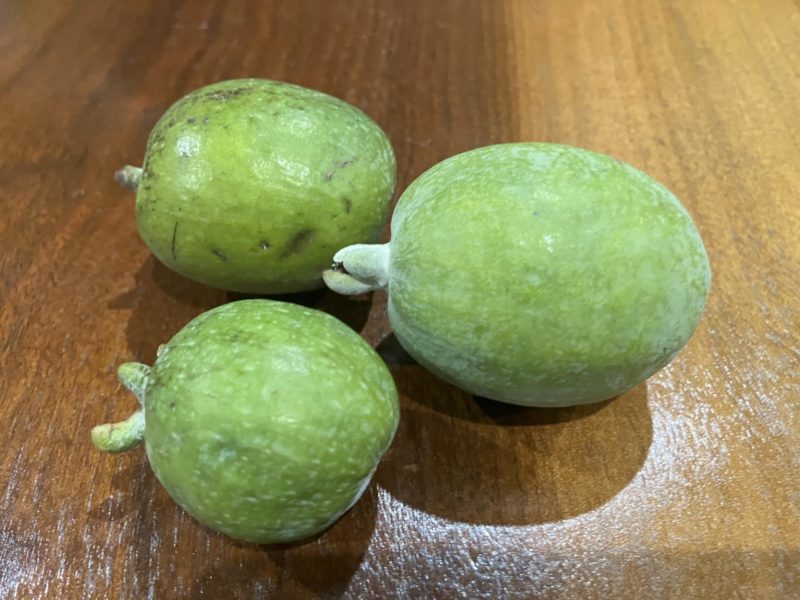 我が家、結構植木を植えてまして、こちらは先日庭に落ちてたフェイジョアという木の実です。