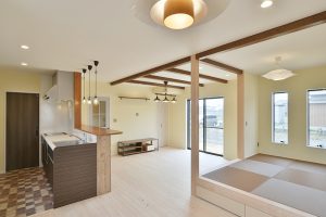 家族が集まるリビングは広く、明るく、陽当たりよく!子育てしやすいシンプルモダンな平家住宅。