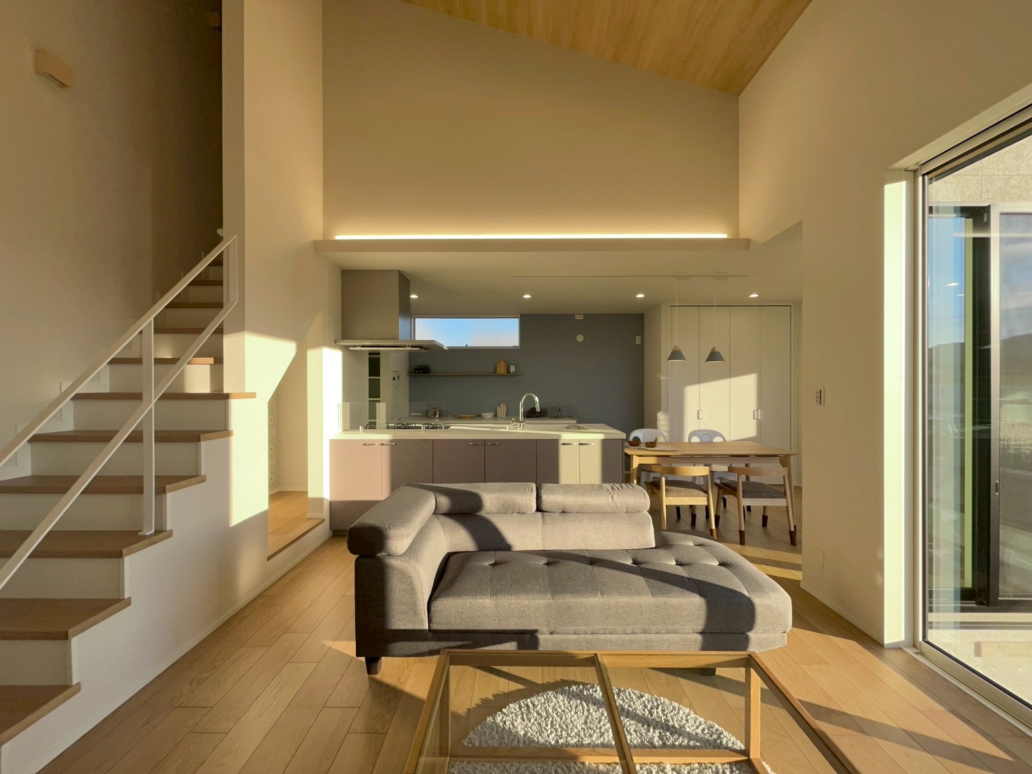 天井の高さが変わることで空間を緩やかに区切ることでリビングとキッチンの空間にメリハリが作れます。