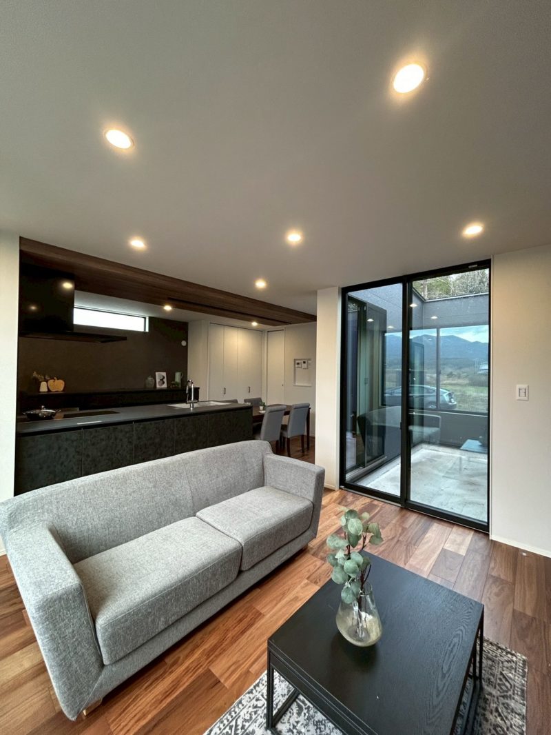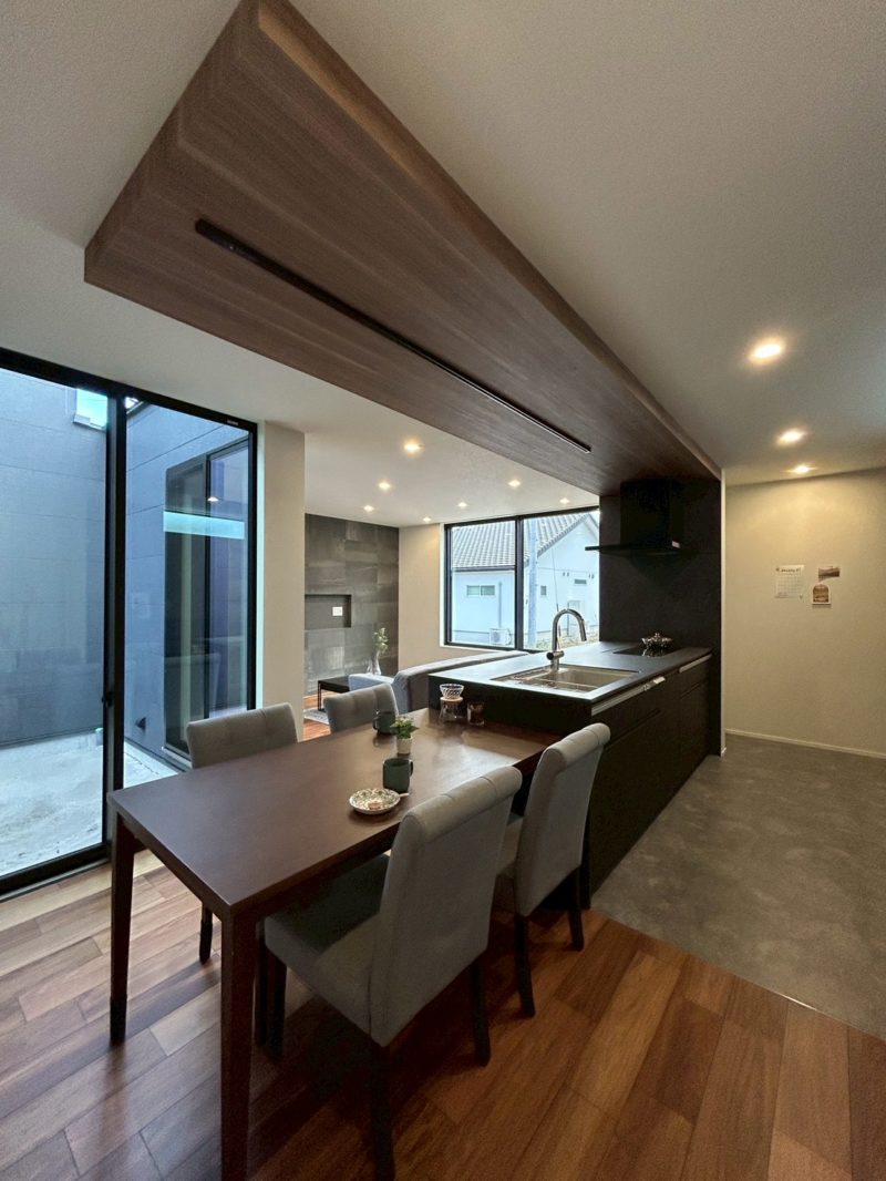 濃いグレーのオープンキッチンと木目調の下がり天井がLDKのデザイン性を高め、