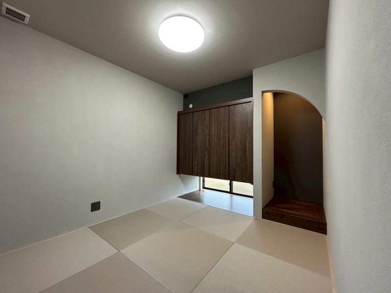 壁は塗り壁、床の間はアーチ状の下がり天井、吊り押入に