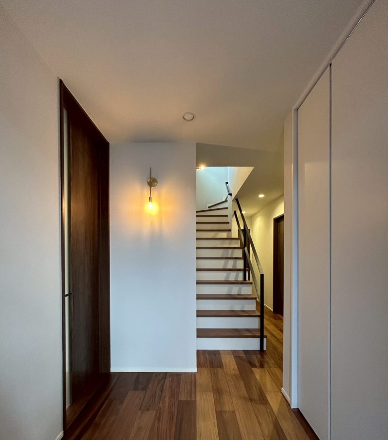 ブラケットライトと階段のアイアン手すりが可愛く演出