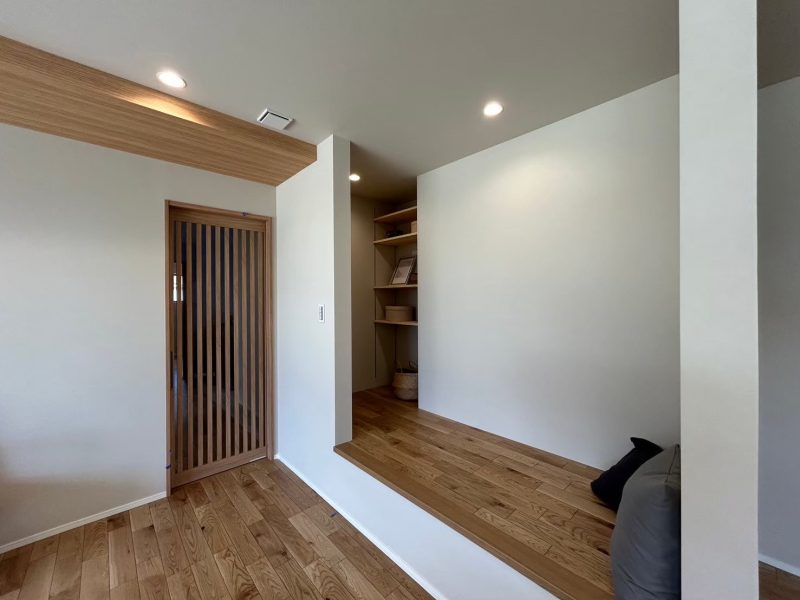 おしゃれな格子引き戸を開けると木目調のクロスや