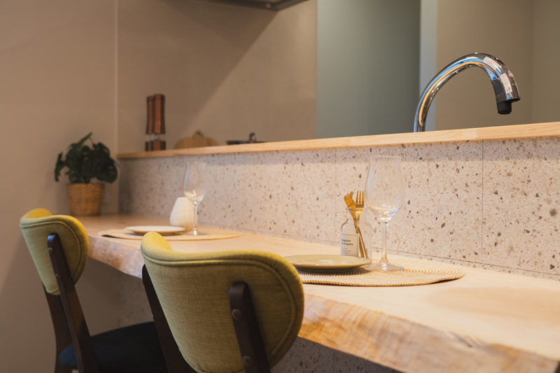 ◯カップボード上には、ご趣味のお酒を飾れるカウンターとシックなアクセントタイル。