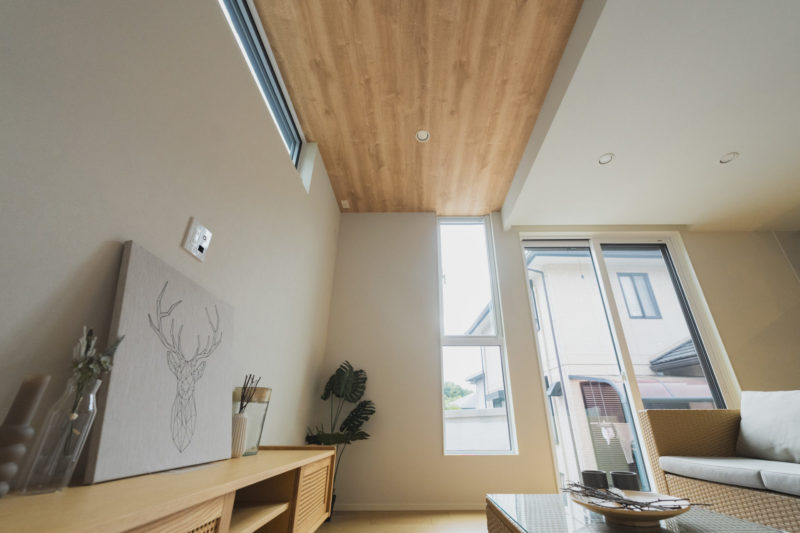 ◯リビングの一段上がった天井には木目のアクセントクロスで温かみをプラス。