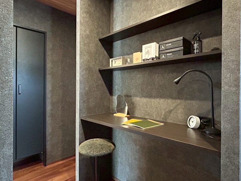 全面ダークグレーのクロスにダークな木目調天井が広がるクールな印象になるコーディネートです。